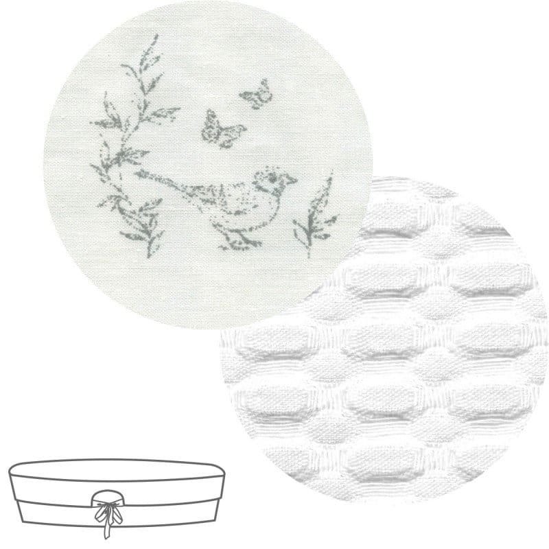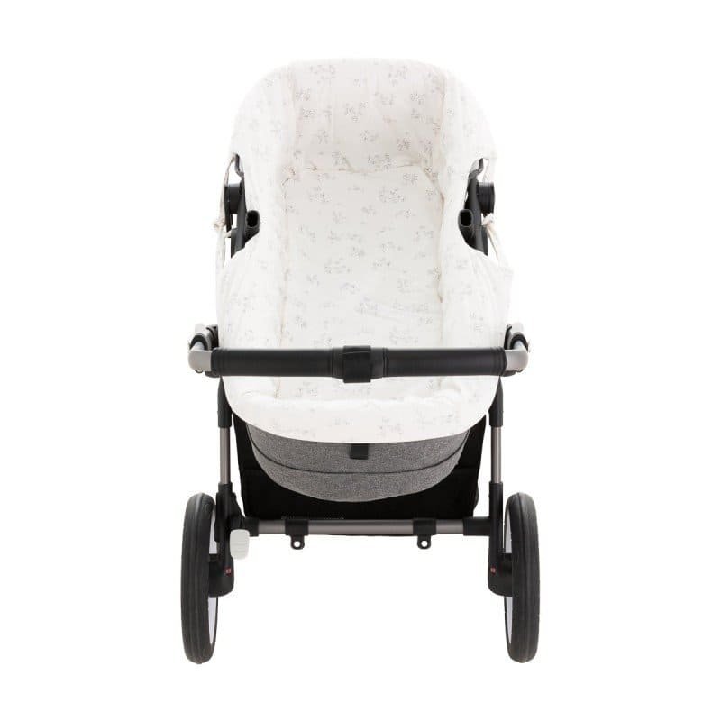 Funda acolchada para el capazo. Queda integrada en el capazo, gracias a sus cintas laterales. Se pone encima del colchón creando un espacio de confort para el bebé. Fabricada con tejido de algodón.