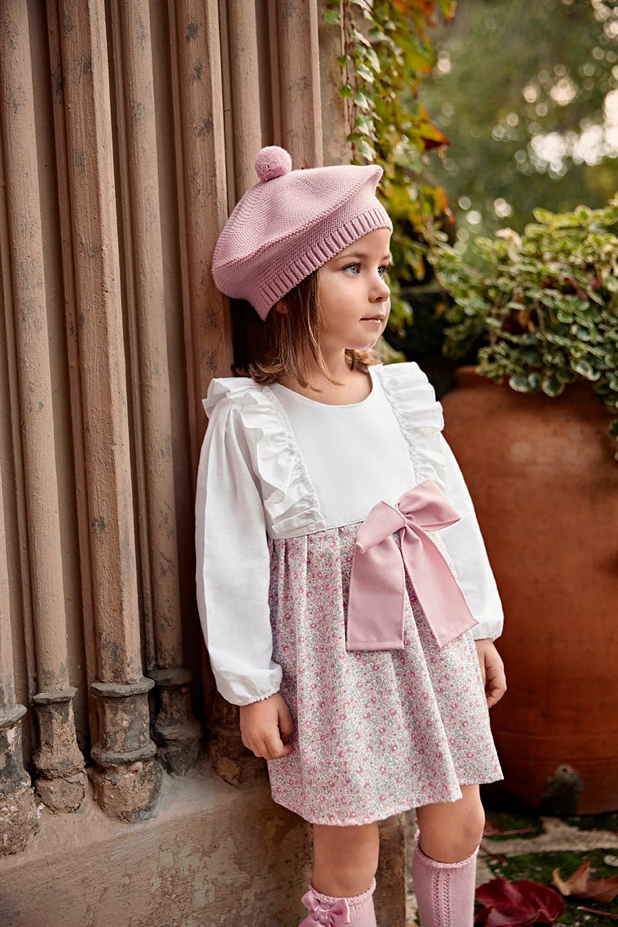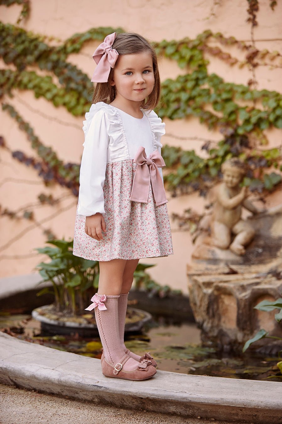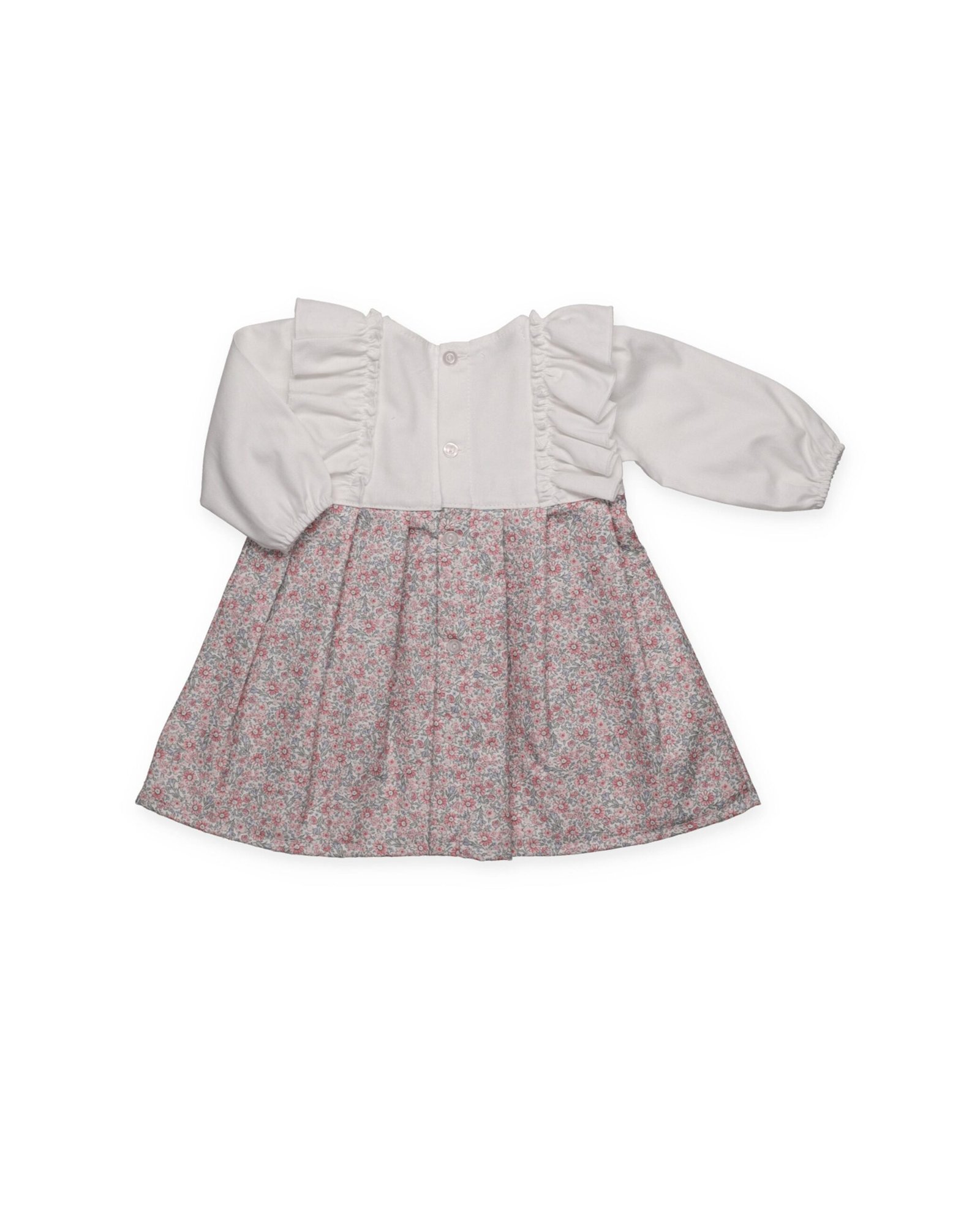 Vestido de manga larga con cuerpo de tela blanco y detalle de volantes en el delantero. La falda luce un delicado estampado floral en tonos maquillaje, rematada con un gran lazo central que aporta un aire romántico y atemporal.